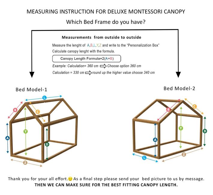 Montessori Tente Cibinliklerimiz, yatak çerçevenizin tam ölçülerine göre özel olarak üretilir. Ölçülerinizi doğru bir şekilde sağlamanız ve doğru uzunluğu seçmeniz çok önemlidir. Ölçüler (A,B,C,D,L,Y,Z sağlanmazsa, tente üretilemez ve sipariş iptal edilir. Eğer ölçüler sağlanırsa, seçilen uzunluğun yatak için uygun olup olmadığını kontrol edebiliriz.